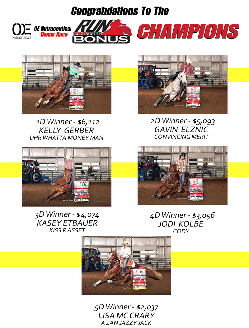 BRIF PAYOUT (BONUS MONEY) BARREL RACING INCENTIVE FUND times were taken from SUN open jackpot session only. No additional entry fee. $8000 Futurity, $5,000 Open.